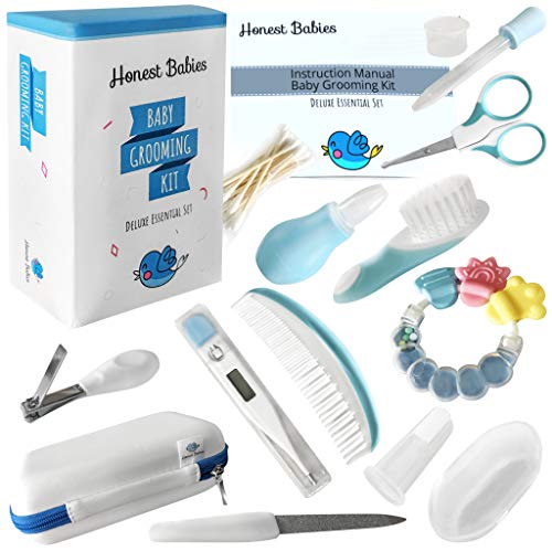 3.) Baby Grooming Kit – Complete 12 Piece Set Deluxe Essential Set Safe for Babies and Toddlers Includes Thermometer Nail Clipper Hair Brush Infant Comb Nail Files Scissor Nasal Aspirator