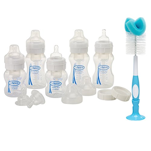 Dr. Brown’s bottles feature a patented internal vent system that eliminates the vacuum and air bubbles to help reduce colic spit up burping and gas. The positive pressure design allows babies to feed comfortably because the vent system eliminates the air bubbles and vacuum. Baby feeds comfortably while the milk flows freely like breastfeeding. Helps maintain vitamins C A & E plus lipids. Easy to clean dishwasher safe BPA free . Includes 3 8oz bottles with Level One Nipples 2 4oz bottles with Level One Nipples 2 Level 2 Nipples 2 Storage/Travel Caps 3 Cleaning Brushes. It also comes with Bottle Brush designed for use with all standard and wide neck Dr. Brown’s Natural Flow baby bottles. It features a combination sponge and bristle brush head for thorough easy cleaning of all Dr. Brown’s baby bottles. It has fixed chevron channels at the base of the Bottle Brush which are designed specifically to clean nipples with ease. While the Microwave Steam Sterilizer is uniquely suited to fit Dr. Brown’s Bottles. It sterilizes up to 4 bottles. It holds standard or wide neck bottles. The sterilizer is dishwasher safe uses tap water and includes plastic tongs. More Reviews On Amazon